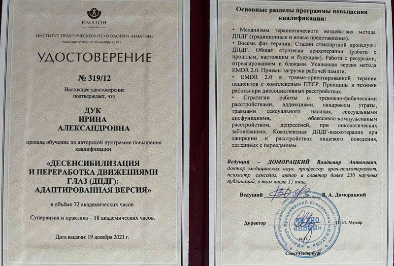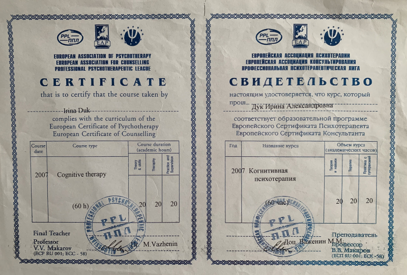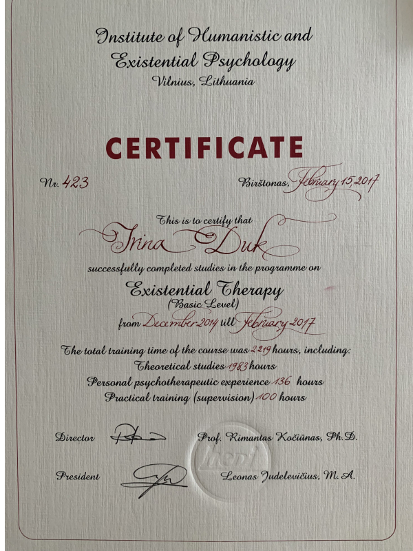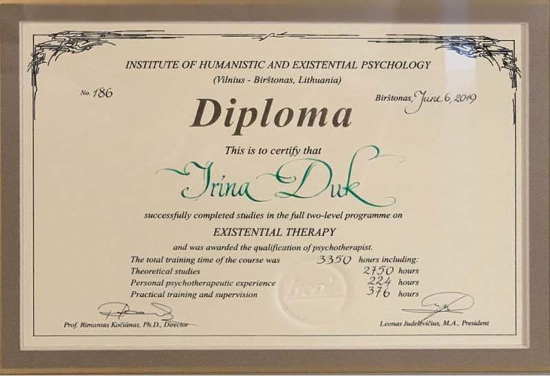 Я, Ирина Дук, медицинский психолог высшей категории, экзистенциальный терапевт. С 2015 года являюсь членом Восточно-Европейской Ассоциации экзистенциальной терапии (ВЕАЭТ).