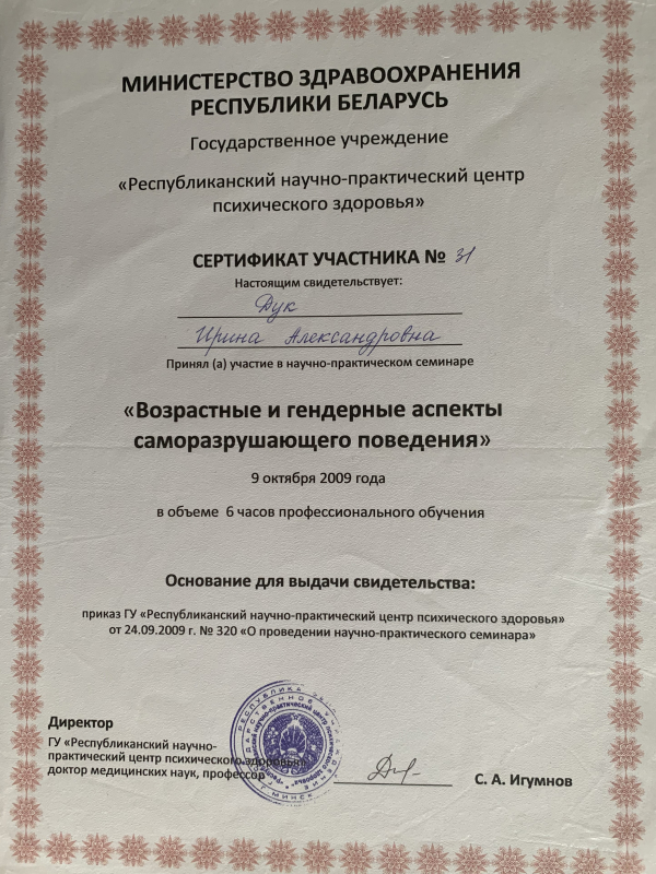 - 2009 г. – Участник научно-практического семинара «Возрастные и гендерные аспекты саморазрушающего поведения» в ГУ «РНПЦ психического здоровья»
