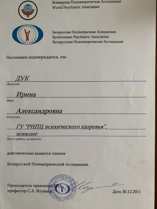 - 2012 г. – «Психологическая коррекция кризисных суицидоопасных состояний» в ГУО «БелМАПО»