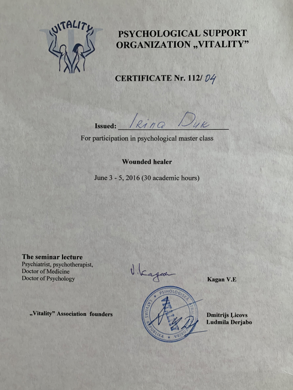 - 2016 г. - Участник мастер класса «Раненый целитель» в Психологическом центре «Виталити» (Латвия, Рига)