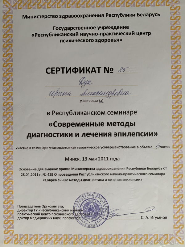 - 2011 г. – Участник Республиканского семинара «Современные методы диагностики и лечения эпилепсии» в ГУ «РНПЦ психического здоровья»