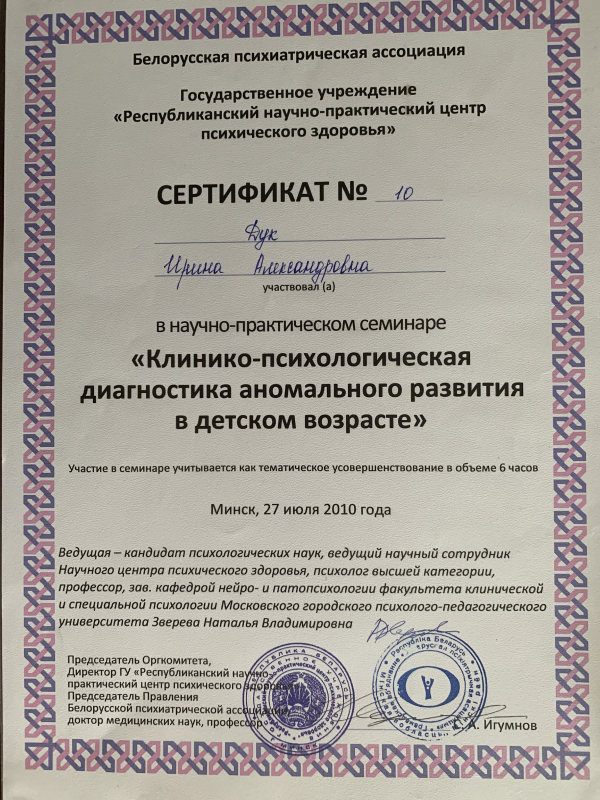 - 2010 г. – Участник научно-практического семинара «Клинико-психологическая диагностика аномального развития в детском возрасте» в ГУ «РНПЦ психического здоровья»