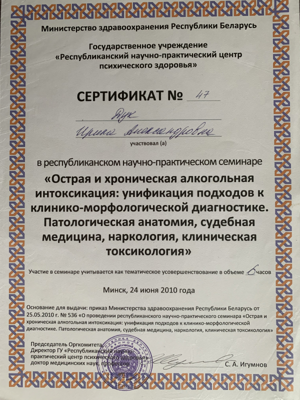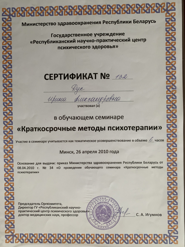 - 2010 г. – Участник обучающего семинара «Краткосрочные методы психотерапии» в ГУ «РНПЦ психического здоровья»