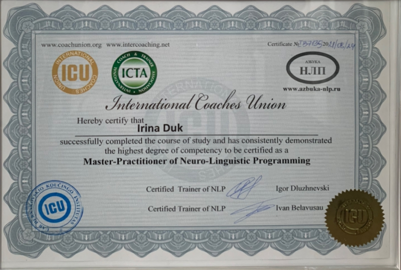 - 2021 г. - Международный сертификационный курс «НЛП-мастер» в Международном тренинговом центре «Азбука НЛП»