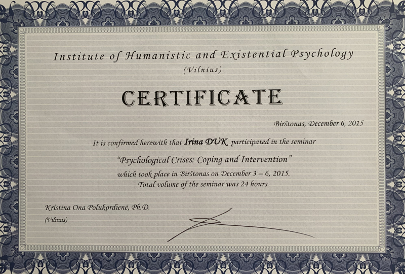 - 2015 г. - Участник семинара «Психологические кризисы: преодоление и вмешательства» в Институте гуманистической и экзистенциальной психотерапии (Литва, Вильнюс – Бирштонас)