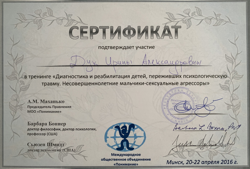 - 2016 г. - Участник тренинга «Диагностика и реабилитация детей, переживших психологическую травму. Несовершеннолетние мальчики – сексуальные агрессоры» в Международном общественном объединении «Понимание»