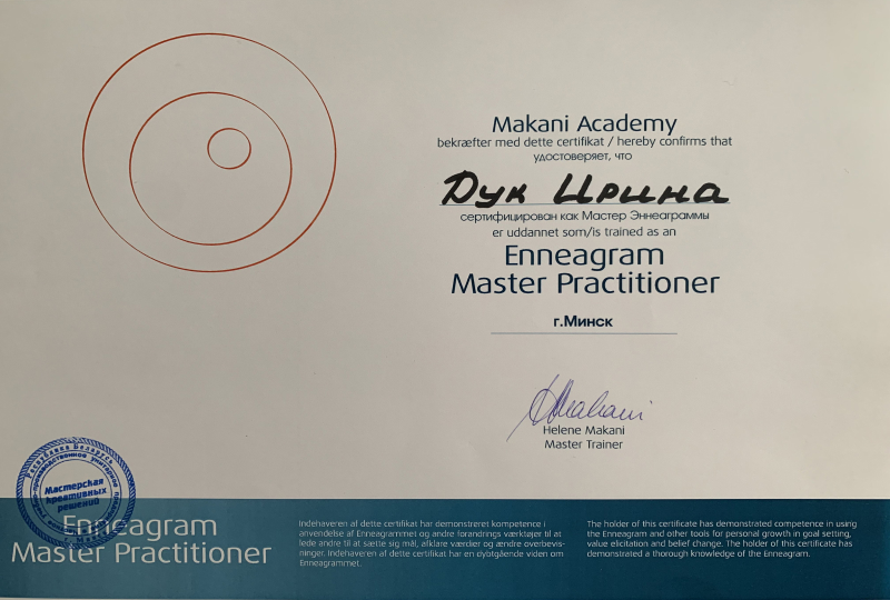 Практик Эннеаграмы (Эннеаграмма - современная типология личности, выявление моделей поведения, ведущих глубинных мотиваций, пути развития личности, профессиональный отбор) - 2007 г. - «Когнитивная психотерапия» в Европейской Ассоциации Психотерапии, Европейская Ассоциация Консультирования, Профессиональная Психотерапевтическая Лига