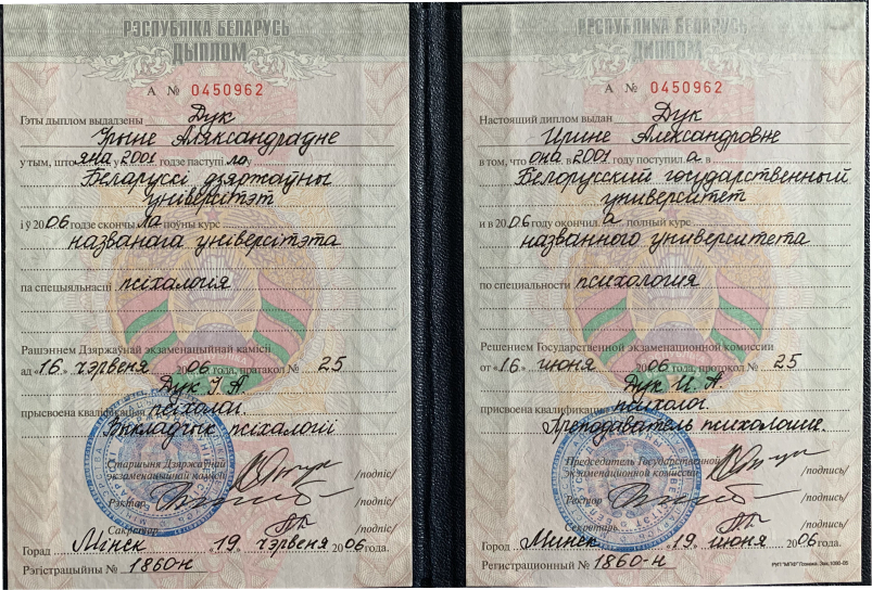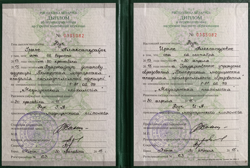 Квалификация: психолог, преподаватель психологии - 2013 г. – 2015 г. Белорусская медицинская академия последипломного образования